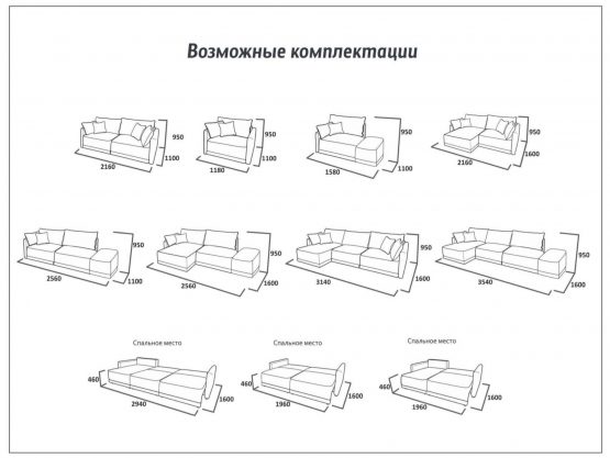 - У модели – два вида боковин: обычная и боковина-пуф. Все модули универсальные (можно переставить право-лево).